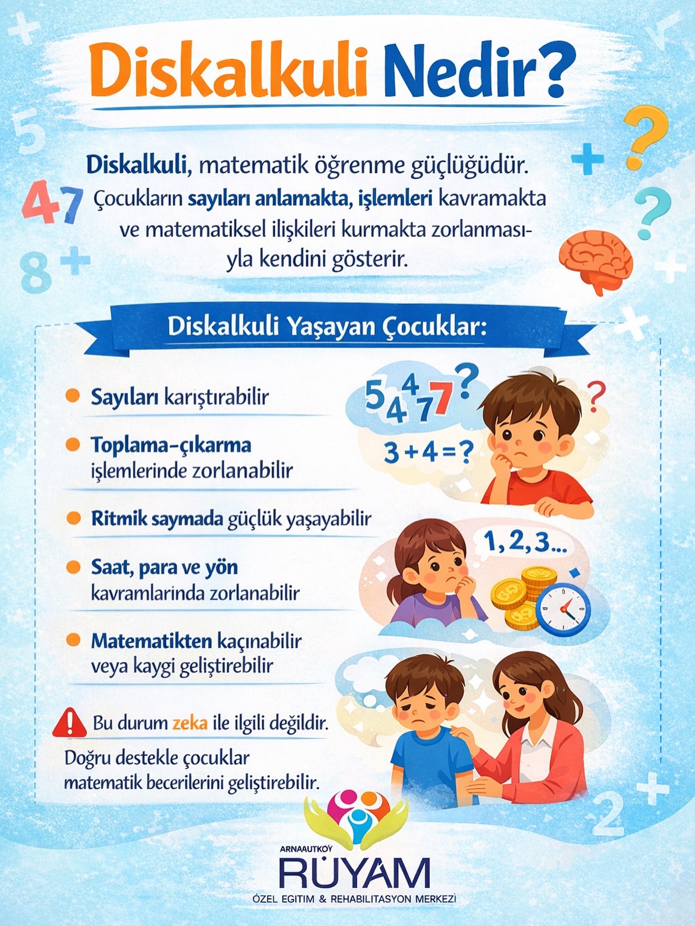 Diskalkuli, çocukların matematik becerilerini öğrenme sürecinde zorlanmasına neden olan özel bir öğrenme güçlüğüdür.Bu durum tembellik ya da ilgisizlik değildir; doğru yöntemler ve uygun eğitim desteği ile çocukların matematik becerileri geliştirilebilir.Arnavutköy Rüyam Özel Eğitim ve Rehabilitasyon Merkezi olarak çocuklarımızın bireysel ihtiyaçlarını dikkate alarak matematiksel becerilerini destekleyen özel eğitim çalışmaları yürütmekteyiz.Uzman kadromuzla çocukların öğrenme sürecini güçlendirmeyi, özgüvenlerini artırmayı ve akademik gelişimlerini desteklemeyi hedefliyoruz.Her çocuk doğru destekle öğrenebilir. #diskalkuli#öğrenmegüçlüğü#özeleğitim#rehabilitasyon#çocukgelişimi
